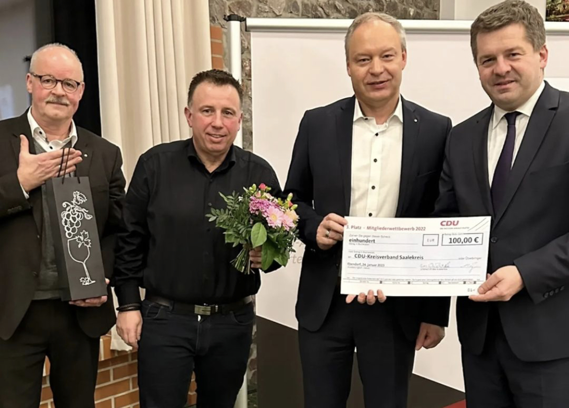 Der CDU-Kreisverband Saalekreis erreichte zusammen mit Mansfeld-Südharz Platz 3. Gemeinsam mit dem CDU-Landesvorsitzenden, Minister Sven Schulze und Landesgeschäftsführer Mario Zeising überreichte Generalsekretär Mario Karschunke die Preisgelder, die den Kreisverbänden zur freien Verfügung stehen.