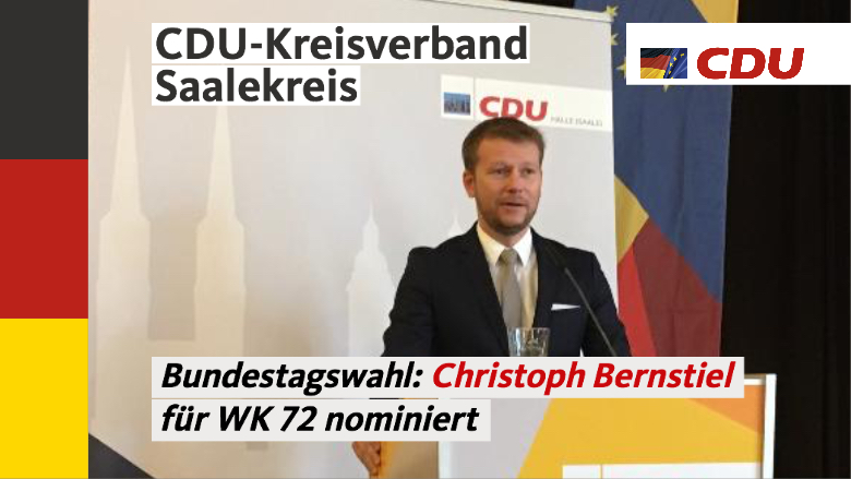 Die Wahlkreismitgliederversammlung stimmte am 12.09.2020 für Christoph Bernstiel MdB als Direktkandidaten für den Bundestagswahlkreis 72 (Halle). Das Mitglied des Bundestages wurde mit großer Mehrheit nominiert.