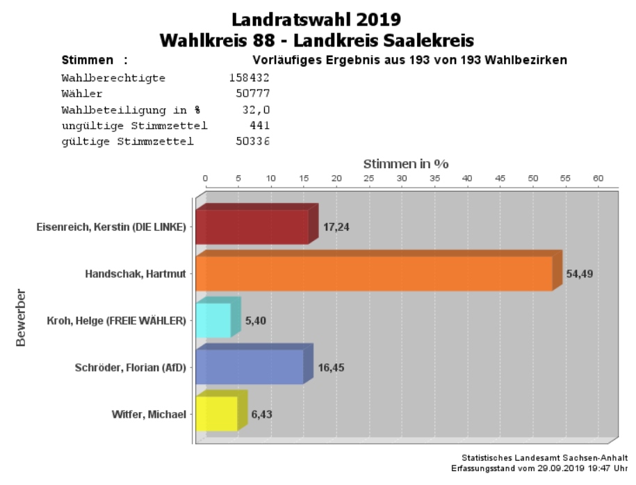 Am 29.09.2019 wurde bei der Wahl des neuen Landrats des Saalekreises Hartmut Handschak im ersten Wahlgang direkt gewählt. Mit 54,49% setzte er sich sehr deutlich von den Mitbewerbern ab. Herr Handschak hat in den vergangenen Jahren als stellvertretender und amtierender Landrat für den Saalekreis gearbeitet. Er tritt die Nachfolge von Frank Bannert an und wird als Parteiloser von der CDU Saalekreis unterstützt.