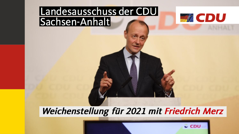 Nach den Grußworten des Ministerpräsidenten Reiner Haseloff und des Magdeburger Kreisvorsitzenden Tobias Krull MdL folgte der rednerische Höhepunkt der Veranstaltung. In seiner mitreißenden Rede spannte Friedrich Merz einen Bogen von den Kommunal-, Europa- und Landtagswahlen zu den Zukunftsthemen der Gesellschaft. Im Mittelpunkt stand zunächst die Außen- und Sicherheitspolitik. Friedrich Merz errinnerte an die friedliche Revolution von 1989 und stellte klar, dass wir gerade jetzt in der Weltpolitik wieder vor großen Herausforderungen stehen. Allein in den letzten 4 Jahren sind mit dem Brexit, der Russland-Ukraine Krise, der Präsidentschaftswahl in den USA und dem 90. Parteitag der KP Chinas Konflikte entstanden, auf die auch die deutsche Gesellschaft und die CDU Antworten finden müssen. Weitere Schwerpunkte waren die Entwicklungen in der Umwelt- und Energiepolitik sowie Wirtschafts- und Sozialfragen. Neben der notwendigen inhaltlichen Diskussion betonte Friedrich Merz, dass die CDU mit Optimismus und Freude an der politischen Arbeit die Herausforderungen der Zukunft annehmen muss. Mit den Worten "es liegt an uns" beendete er unter anhaltenden Applaus der Delegierten seine Ansprache an den Landesausschuss.