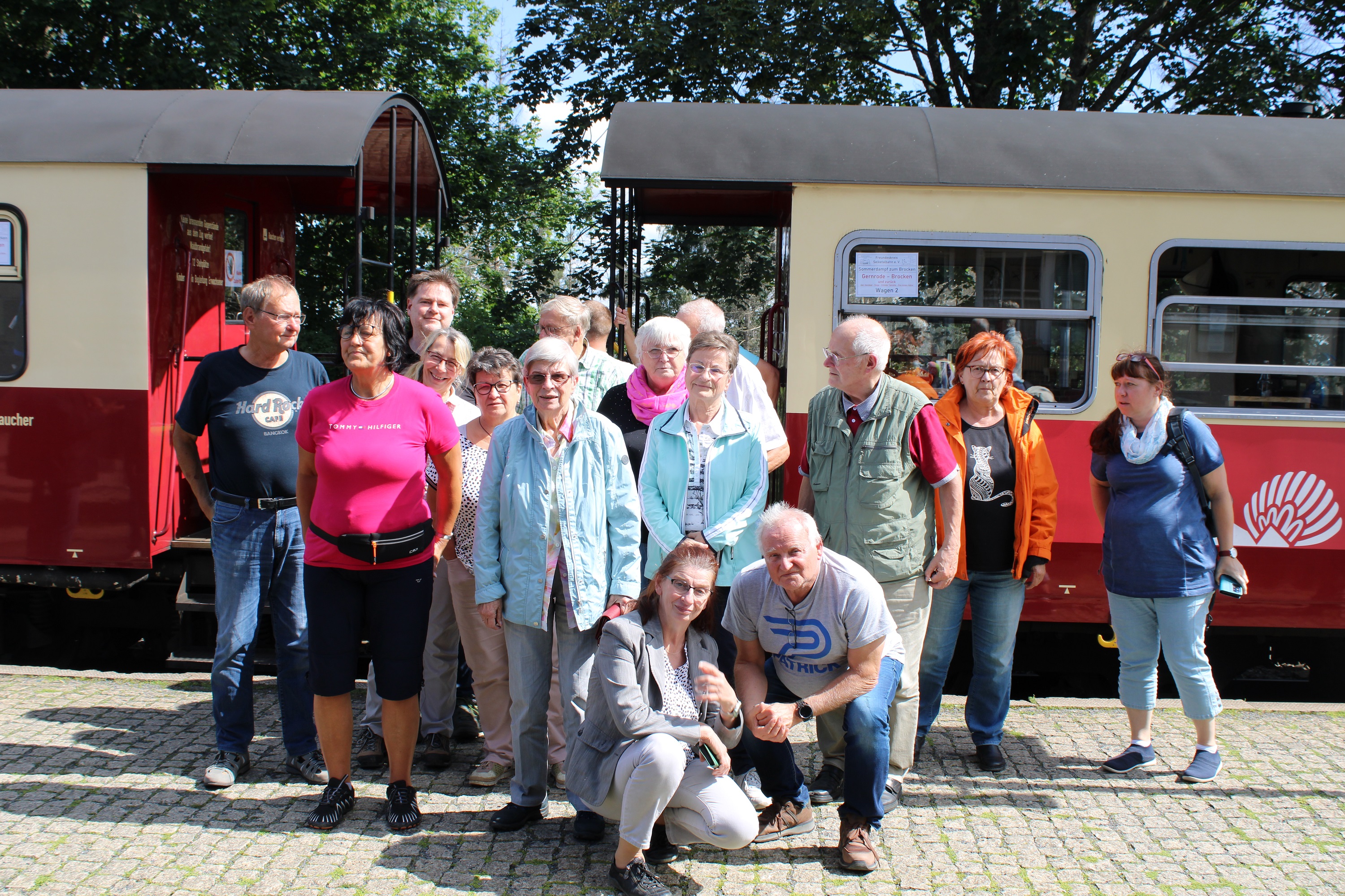 Am Sonnabend dem 13.07. war es dann soweit. Wir fuhren mit dem Sonderzug zum Brocken. Trotz der Abfahrtszeit um 8:00 Uhr in Gernrode waren alle Mitfahrer rechtzeitig vor Ort. Während der Fahrt wurden wir hervorragend vom Selketalbahnverein gastronomisch und organisatorisch betreut. Über den Zustand des Waldes und die entsprechenden Kahlflächen die wir bei der Fahrt zu sehen bekamen waren alle entsetzt. Auf dem Brocken hatten wir einen längeren Aufenthalt bei dem wir dank des guten Wetters eine hervorragende Fernsicht hatten. Mit dabei waren u.a. unsere Bildungsministerin Eva Feussner und Prof. Merbach. Rückkehr in Gernrode war 20:00 Uhr.